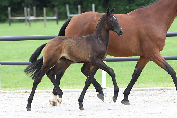 Sire Cornet Obolensky managed to develop into an absolute top progenitor next to his outstanding career as a jumper, including participation at the Olympic Games. At the highest level he is represented by excellent offspring like Cornet d'Amour, Cornado NRW, Cornet's Cristallo, Comme Il Faut and Cocoshynsky. On mothers side we find the outstanding international sport and breeding stallion Berlin. Le Cornet R.T. descends from the same line as the KWPN-approved champion stallion L'Esprit (s.Lupicor), who jumped on international 1.45m level with rider Caroline Müller. L'Esprit is bred out of the well tested mare Hera O (s.Landgraf I), the great granddam of this foal. Hera O also produced a 1.35m-jumper while the eldest descendant of granddam Tactique jumps at 1.30m level. |