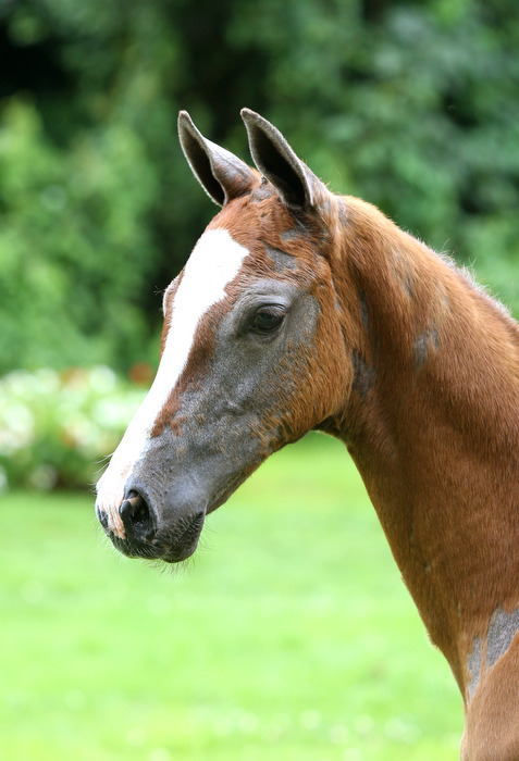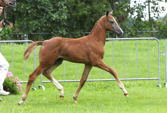 De interessant gefokte hengst Bugatti VDL maakt veel indruk met zijn enorme springkwaliteiten en presenteert hier een veulen uit zijn eerste jaargang. Moeder Uppsala stamt net als toppaarden als Kris, Londontimes en Obelix af van Goodtimes. Grootmoeder Calinde geniet bekendheid als grootmoeder van de KWPN-hengst Prestige VDL (v.Silvano N), bovendien is zij een halfzus van de Bayern-gekeurde hengsten Landron B (v.Landgraf I) en Lordron B (v.Lord). Vervolgens gaat de moederlijn via Ahorn Z, Ronald en Cor de la Bruyère terug op de Anblick xx-dochter Ozol. Zij is een halfzus van de befaamde stempelhengst Rigoletto (v.Ramzes x) en is grootmoeder van het Grand Prix-springpaard Eurocommerce Montreal (v.Athlet Z). Holstein stam 456 |
