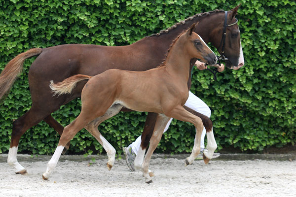 Edward Gal heeft torenhoge verwachtingen van de getalenteerde Glock's Toto Jr., die veel gelijkenissen met zijn fenomenale vader Totilas vertoont. Hem lijkt dan ook een grote carrière in de sport te wachten en hij presenteert dit jaar zijn eerste jaargang veulens. Als moeder van dit veulen staat de merrie Golden Corofino Texel te boek, die afstamt van de Lichte Tour-geklasseerde Charmeur. Onder Madeleine Witte-Vrees valt deze sterk bewegende vererver positief op. Zowel grootmoeder W.Corofino Texel als overgrootmoeder P.Corofino Texel bewezen hun dressuuraanleg in de sport op Z2-niveau. In de derde en vierde generatie voegen de stempelhengsten Voltaire en Corofino I hun verervingskracht toe aan deze van oorsprong Holsteiner moederlijn. BTW plichtig ja. |