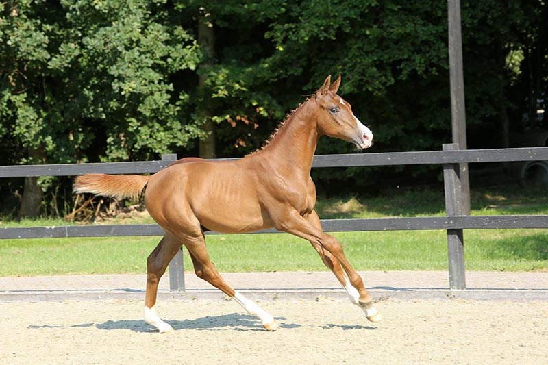 Onder Harrie Smolders behoorde Don VHP Z jarenlang tot de wereldtop, zo wonnen ze zilver op het EK in Göteborg. Hij is hier gekoppeld aan Holsteiner stam 2895. Overgrootmoeder Delicia staat tevens aan de basis van de 1.40m-geklasseerde Quadras (v.Quadros) van Niklaus Schurtenberger. BTW-plichtig |