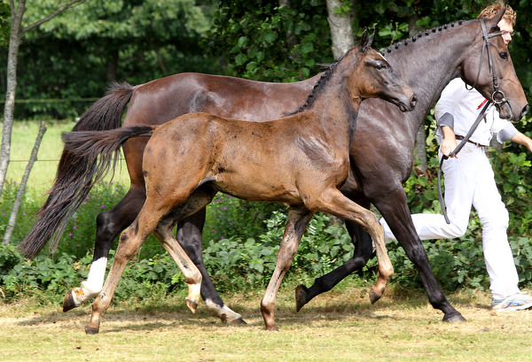 Sire Glasgow van het Merelsnest has a very good pedigree and shows very much scope and talent. His dam is a full sister of the renown Grand Prix-mare Sapphire (s.Darco), ridden by Mclain Ward. Gladstone D.N. is also representing a special damline himself. Dam Upchidee is a half-sister of the National Champion-mare and IBOP-hit Chinchidee (s.Chin Chin), the NRPS-approved stallion Original VDL (s.Oberon du Moulin) and the national jumping, Oldenburg-approved Quite Magic (s.Quidam de Revel). Also the Zangersheide-approved 1.50m-level jumper Ultimate VDL (s.Indoctro) is a product of granddam Orchidee. A full brother of dam Upchidee is jumping on 1.35m-level and she produced this year a National Keuring-mare (s.Indorado). |