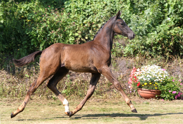 Sire Armani is bred out of a full sister of the well-known European Champion Jerich Parzival (Adelinde Cornelissen). His first offspring shows a lot of talent and they are performing well on the foal-keurings. Gilbert is a half-brother of the Small Tour-dressagehorse Udo (s.Gribaldi). Damsire Houston also achieved good results in the Small Tour and he produced many international dressagehorses like Broere Valdez, Ocean Gold, Radetzky and the Grand Prix-horses Maxmilaan and Nicky. Granddam Carina brings in the wanted Thoroughbred-genes via her sire Tangelo xx and she already produced a 1.30m-level showjumper. From this direct damline are fourth level-dressagehorses like Toronto and Nobilis. |