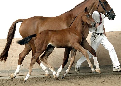 Her sire Special D represented the Netherlands at the World Championship for young dressage horses in Verden this year. Under the saddle of Diederik van Silfhout he was placed 11th. Dam Jirdonie, awarded with the predicates keur and prestatie, is the renowned dam of the successful dressage horses Luxform’s Nimbly (Grand Prix), Olympus (Prix St. Georges), Popey (Prix St. Georges) and Trippel (Z level dressage and participant of the half finals of the PAVO cup 2005). Great grandam Simone produced many national sport horses. This lineage is also the basis of the licensed stallion Orion (Krawall xx). Amira Ardonie was invited for the national foal keuring in Ermelo. Her half sister (Odermus) is also invited for the national mare keuring due to her score of 80 points for free jumping. |