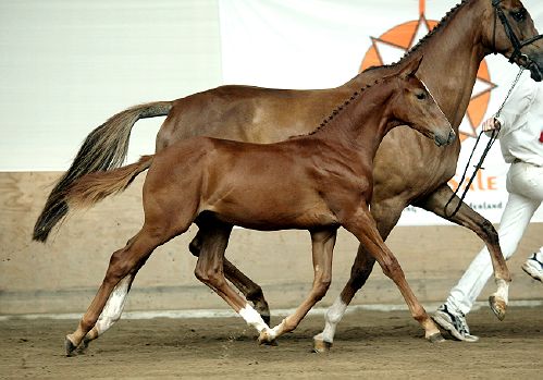 Sire Mermus R is, like the renowned Grand Prix show jumpers Gadermie, Kind Kadermie, Toys R and Germus R, an offspring from the Dermie lineage. His son Sam R got a seldom given score of 10 points at the stallion performance test. Grandam Derina jumped at Z level and is full sister of the international jumper Piccolino. This line goes back to the famous Sina lineage which produced many international sport horses like Rocksina, Cavalier (ex San Patrignano Mister), Obelix, TSP Nerina, Den Ham and Nintendo. |