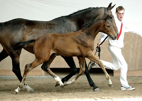 The Belgian stallion Triomphe de Muze is amongst the best sons of Chin Chin in sport. Under David Jobertie he won the Grand Prix of Bresse and Bourg. This beautiful mare foal Alwendy v.d. W. was champion of the foal keuring in Tolbert. On dam’s side the keur awarded Niwendy carries the valuable blood of Indoctro of which his son Nassau won the bronze medal at the European Championships in 2005. Grandam Wendy produced the Grand Prix dressage horse Chaucer. Stallions like Garmisch and Unaniem are also coming out of this lineage. |