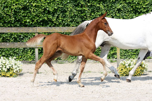 This well known dam line originates at the Erdball xx mare Paerel, who is also stands at the founding basis of the phenomenon Big Star (s.Quick Star), the KWPN approved stallions Amethist (s.Nimmerdor) and Matterhorn (s.Ahorn), but also with several other international show jumpers. Dam Urette VDL jumped at 1.30m level and descends from the international sport and breeding stallion Corland, who is reknown for his offspring like Silvana HDC, Bacardi VDL and Apardi. Granddam Firette produced multiple 1.30m jumpers. This year sire Arezzo VDL successfully debuted at the highest level with rider Jessica K?rten. He seems pass on his great jumping qualities to his offspring. |