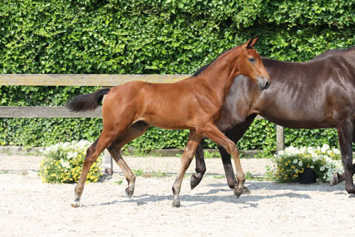 This particular filly represents a leading performance family. Granddam Zancara is known as the mother of the Olympic KWPN stallion Bubalu VDL (s.Baloubet du Rouet), the Grand Prix-stallion Montreal VDL (s.Indoctro), Grand Prix-jumper Pessoa VDL (s.Animo), the KWPN stallion Great Pleasure (s.Grannus) and several other international jumping horses. Zancara is also a sibling to Emile Hendrix?s Grand Prix-jumper and approved stallion N-Aldato (s. Aldato). Dam Viancara VDL earned a 9 for her canter and an 8 for her jumping technique in the mare testing. Sire Quasimodo van de Molendreef successfully jumped at the highest level and already produced many international show jumpers such as Scott Brash?s Olympic gold medalist Hello Sanctos and Comte d'Arsouilles. |
