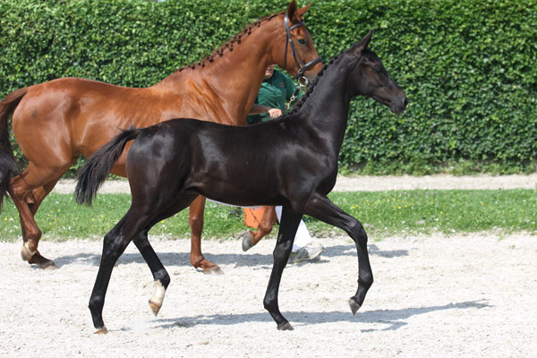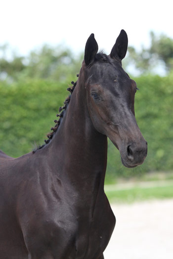 The striking colt has an interesting pedigree. His dam Wanadoo is a full sister of the national Grand Prix dressage horse VMF Zipp of Stephanie de Frel and she was performing on third level herself. In combination with Negro she already produced a third level dressage horse. Kashmir-E is sired by the popular Totilas-son Governor. He was reserve champion at the KWPN stallion show and is bred out of a full sister of Adelinde Cornelissen her top mount Jerich Parzival (s.Jazz). Kashmir-E is out of his first crop of foals. Via Governor the influential Grand Prix stallion Jazz is showing up two times in this pedigree. Also the fourth level dressage horses Magic (s.Zeoliet) and Undercover (s.OO Seven) are out of this family. |