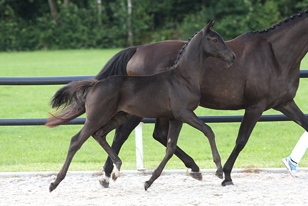 Sire Ebony combines three good gaits with much talent for the higher level. This beautiful eye catcher competed at the WC for young dressage horses with Vai Bruntink for three years in a row and is successful in the Small Tour. Also his first progeny are very promising. Via the allround breeding stallion Wolfgang this pedigree leads back to Thalaika, who produced a third level dressage horse, two mares with high scores in the maretesting sired by Rossini (92pts) and Nimmerdor (90pts) as well as the Paralympic medal winner Ocean Gold (s.Rubinstein I). Besides that, Thalaika is granddam of the fourth level horses Atlantus (s.Prestige VDL) of Julie de Baerdemaker and Vloraikas (s.Florestan I). Great granddam Technue xx brings in valuable thoroughbred genes. |