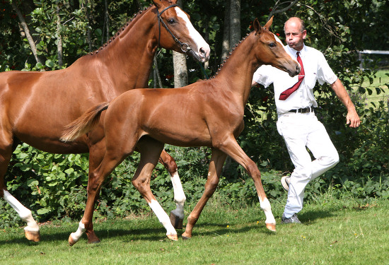 Vader Vivaldi maakt onder Hans Peter Minderhoud heel veel indruk in de dressuurring. Hij leverde al een groot aantal veulenkeuringskampioenen en uit zijn eerste kleine jaargang komen meerdere NMK-merries en CK-kampioenes. Van moederszijde voert deze Elana het bloed van de nationale dressuurhengst Houston, die bekend staat om de vererving van veel dressuurkwaliteit en beweging. Zo kennen we van hem in de internationale sport paarden als Omar, Ocean Gold en Mendelsohn. Een volle zus van moeder Arlana loopt in het Z-dressuur. Grootmoeder Orlana is een halfzus van het nationale dressuurpaard Arioso (v.Purioso). Via haar vader Gregor voert ze het bewezen bloed van Uniform. |
